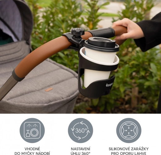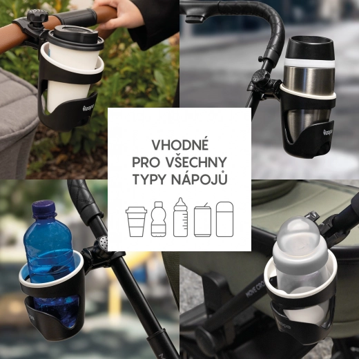 Uživajte v sprehodih ali vožnji s kolesom z prostimi rokami – univerzalno držalo za pijače varno drži kavo, potovalni lonček ali otroško stekleničko. Vrtljiv zglob omogoča nastavitev idealnega kota, da se pijača ne poliva, medtem ko robustna sponka s protizdrsnim vložkom trdno drži na ročaju vozička ali krmilu kolesa brez majanja.