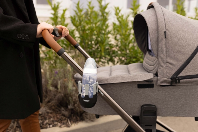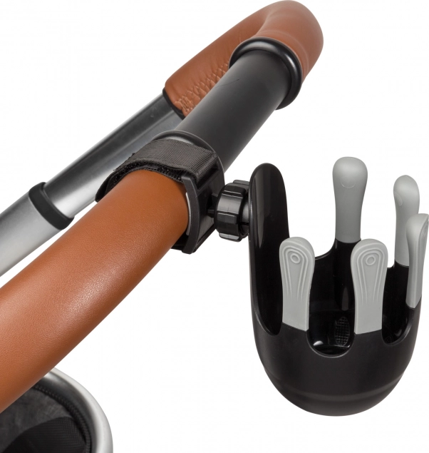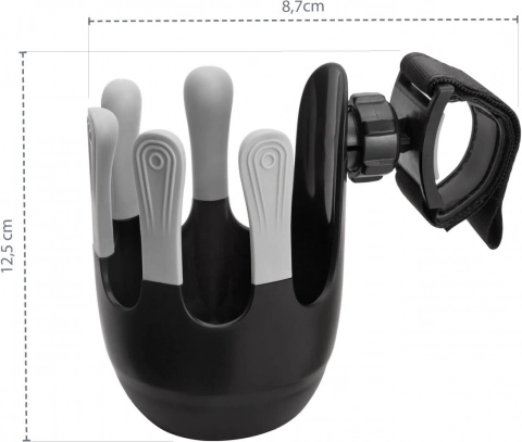 Fleksibilno držalo za pijače je zasnovano tako, da vanj sodijo otroške stekleničke, skodelice za kavo in tudi večje steklenice za vodo do premera 8,5 cm. Sistem z 360° vrtenjem je mogoče zaradi enostavne namestitve s pomočjo ježka pritrditi na ročaj skoraj vsakih otroških vozičkov. Edinstven, sodobno oblikovan petprstni sistem zagotavlja boljšo stabilnost skodelice ali steklenice ter tako preprečuje neželeno razlitje pijače.