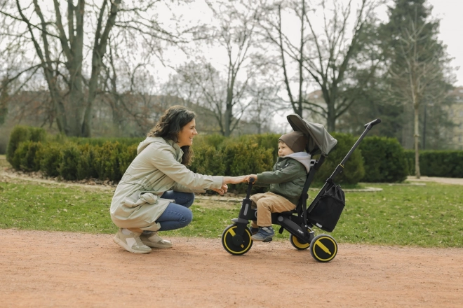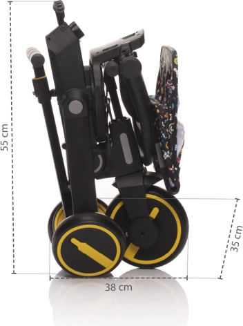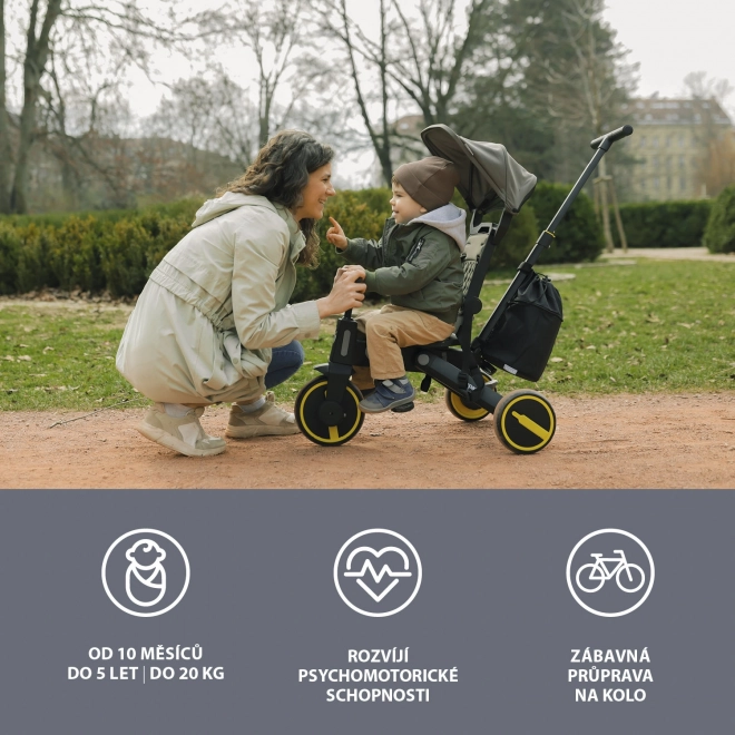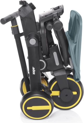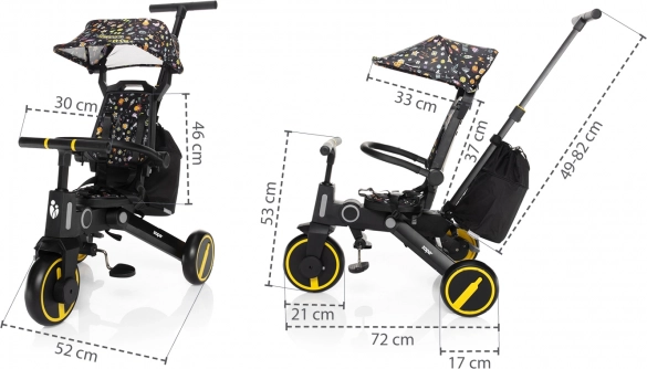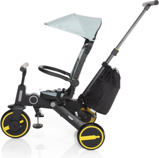 Tricikel je udobnejša alternativa vozičku in hkrati vmesni korak do poganjal in koles. Zahvaljujoč po višini nastavljivi vodilni palici in funkciji izklopa krmila lahko popolnoma nadomesti voziček, otrok pa bo med vožnjo imel več zabave. Odstranljive stopalke je mogoče uporabiti kot pedala, ko otrok tricikel vozi sam, ali pri mlajših otrocih kot oporo za noge. Za udobnejšo vožnjo skrbita sedalni del in naslon za hrbet, opremljena z oblazinjenjem, ki je odstranljivo za lažje čiščenje.