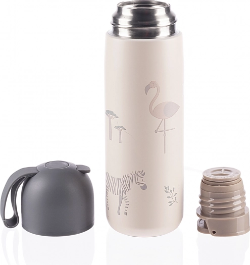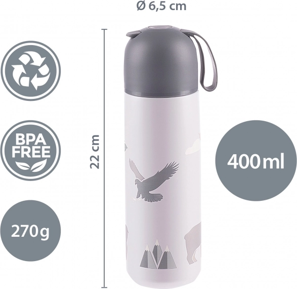 Kakovostna termovka za tekočine s prostornino 400 ml ohranja vroče napitke do 12 ur, hladne pa do 24 ur. Izdelana je iz kakovostnega nerjavnega jekla, odpornega proti koroziji. Tesnilni pokrov zagotavlja, da termovka ne pušča, zgornji zapiralni del za udobno nalivanje pa poskrbi, da se ne polijete niti med vožnjo po neravni cesti; prav tako ste lahko prepričani, da se otrok ne bo polil z vročo tekočino iz termovke zahvaljujoč dvojnemu zapiranju. Pokrov termovke lahko uporabite kot skodelico.