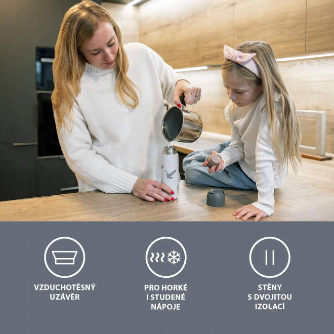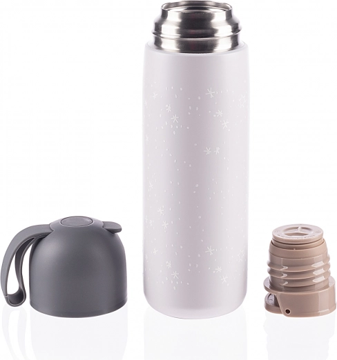 Kakovostna termovka za tekočine s prostornino 400 ml ohranja vroče napitke do 12 ur, hladne pa do 24 ur. Izdelana je iz kakovostnega nerjavnega jekla, odpornega proti koroziji. Tesni pokrov zagotavlja, da termovka ne pušča, zgornji izlivni zamašek za udobno nalivanje pa poskrbi, da se ne polijete niti med vožnjo po neravni cesti; prav tako ste lahko prepričani, da se otrok ne bo opekel s tekočino iz termovke zaradi dvojnega zapiranja. Pokrov termovke lahko uporabite kot skodelico.