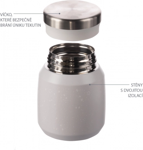 Kakovostna termovka za hrano in kašice s prostornino 300 ml ohranja toplo hrano do 12 ur, hladno pa do 24 ur. Izdelana je iz kakovostnega nerjavnega jekla, ki je odporno proti koroziji. Tesni pokrov zagotavlja, da termovka ne pušča. Zahvaljujoč vakuumski izolaciji se termovka pri napolnitvi z vročo vsebino od zunaj ne segreje.