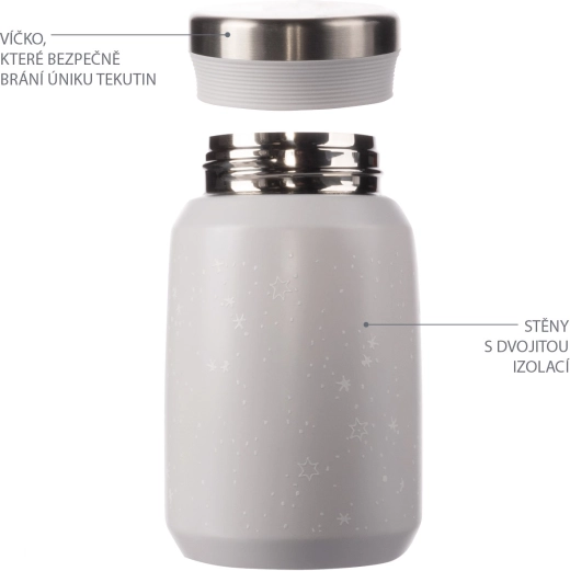 Kakovostna termovka za hrano in kašice s prostornino 500 ml ohranja toplo hrano do 12 ur, hladno pa do 24 ur. Izdelana je iz kakovostnega nerjavnega jekla, ki je odporno proti koroziji. Tesen pokrov zagotavlja, da termovka ne pušča. Zahvaljujoč vakuumski izolaciji se termovka pri polnjenju z vročo vsebino od zunaj ne segreje.