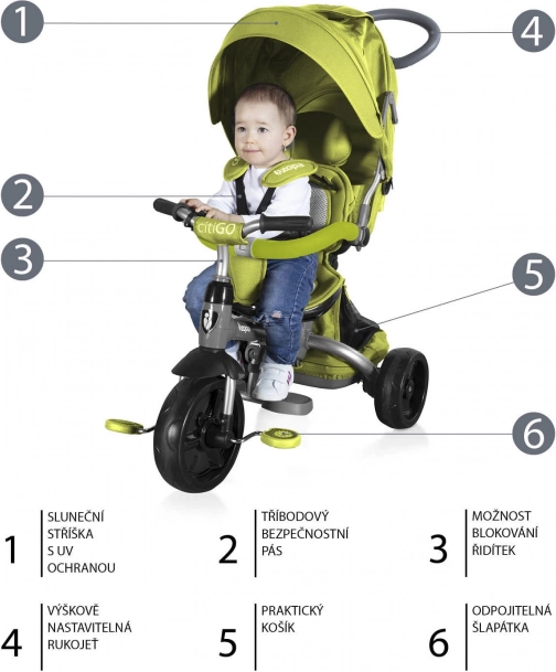 - Demontaža sončne strešice, varovala, sprednjega naslona in pedalov omogoča otroku boljši užitek v vožnji.