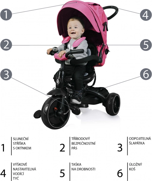 Varnost zagotavljajo varnostni pasovi in praktičen gumb za blokado vrtenja pedalov. Ko otrok raste, lahko postopoma odstranite strehico, varnostni lok, sprednje naslonjalo, pedale in zadnje naslonjalo ter omogočite popolno samostojno upravljanje. Praktična košara in torbica zdržita vse potrebščine za sprehod.