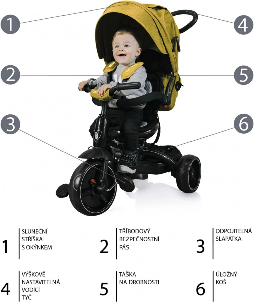 Tricikel Citi Trike z atraktivno barvo Curry Rumena je namenjen otrokom starosti od 10 mesecev do 3 let in ponuja največjo nosilnost 30 kg. Vsebuje vodilno palico z nastavljivo višino za enostavno manevriranje: