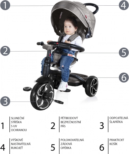 Moderen tricikel za otroke od 6 do 36 mesecev z elegantnim športnim dizajnom. Opremljen je z nastavljivim vrtljivim sedežem, 5-točkovnim varnostnim pasom in strehico z UV zaščito za maksimalno udobje in varnost med vožnjo.