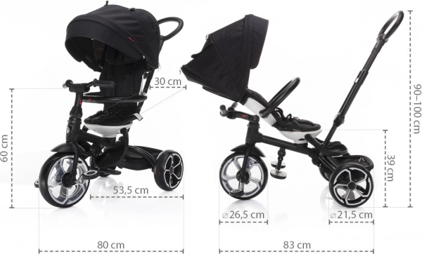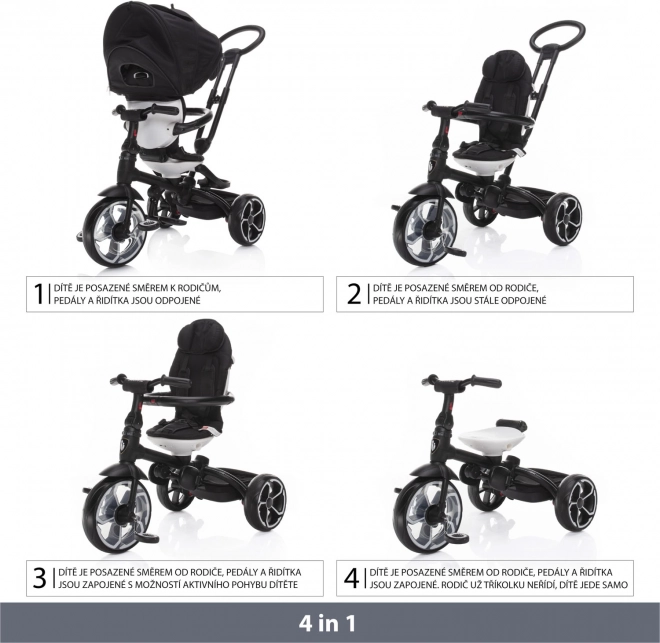 Zahvaljujoč 4 načinom uporabe je tricikel enostavno prilagodljiv rastočim potrebam otroka. Tricikel omogoča vožnjo na štiri različne načine, vključno z načini za aktivno in pasivno gibanje otroka. Starši bodo cenili nastavljiv ročaj, ki omogoča upravljanje tricikla v udobnem položaju.
