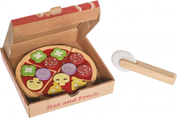 Lesena igrača za otroke predstavlja realistično pizzno sestavljanko, ki nudi zabavo ter spodbuja razvoj otroške ustvarjalnosti. Varna igrača je sestavljena iz 20 elementov, vključno z lesenim rezalnikom in sestavinami na ježka. Posamezni deli so v živih barvah, brez ostrih robov in izdelani iz kakovostnega naravnega lesa, prebarvanega z netoksičnimi barvami.