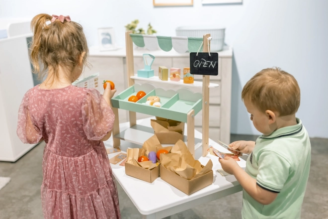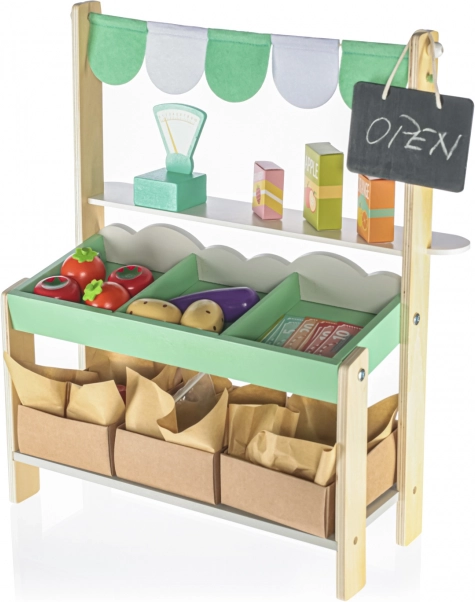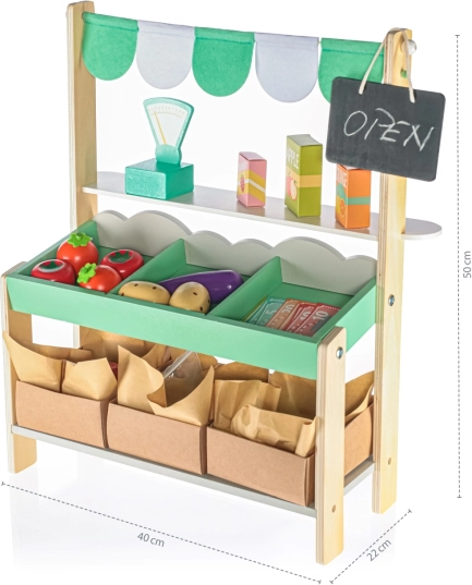 Lesena tržnica polna zabave – zasnovana za spodbujanje ustvarjalnosti in iger vlog pri otrocih. Varnostni in kakovostni leseni materiali zagotavljajo dolgo življenjsko dobo. Otroci bodo uživali ure zabave pri organiziranju svoje tržnice doma ali zunaj na terasi.
