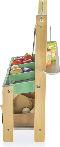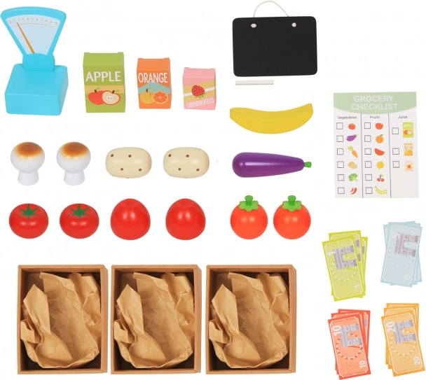 Popolna trgovska oprema – vsi potrebni dodatki so vključeni v pakiranje. Najdete lesene zabojčke, tehtnico, nakupovalni seznam in denar. Otroci lahko prevzamejo vlogo trgovcev in strank ter se učijo, kako deluje tržni svet.