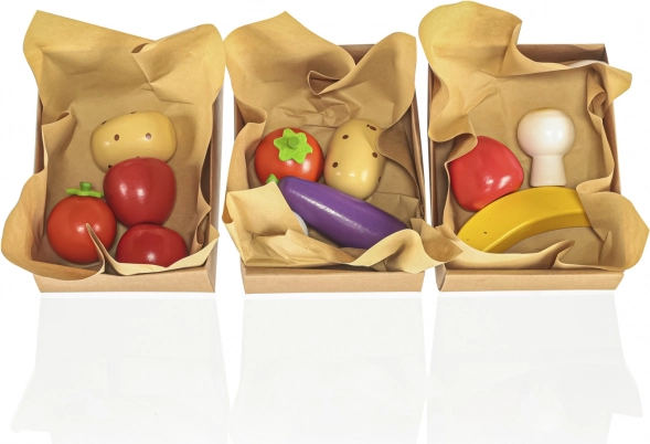 Pakiranje vključuje vse, kar je potrebno za prodajo na tržnici – leseno sadje in zelenjavo, tehtnico in nakupovalni seznam.