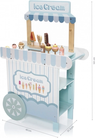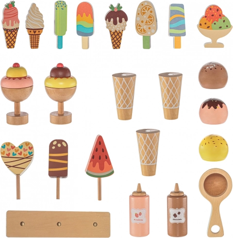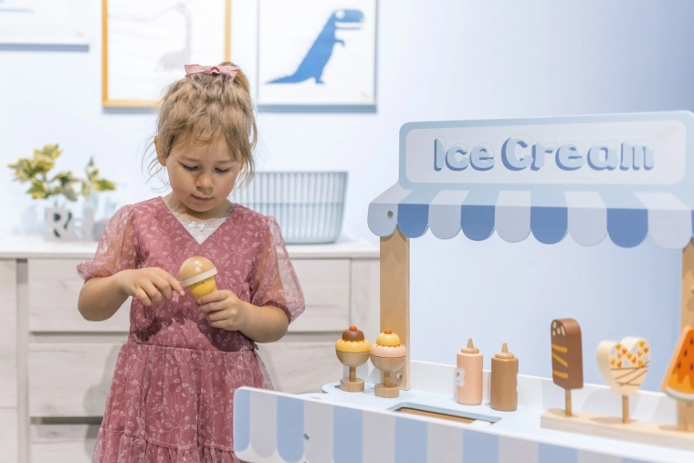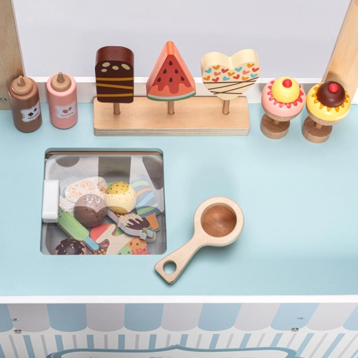 Lesena stojnica za sladoled za otroke spodbuja ustvarjalnost in domišljijo z realističnim dizajnom. Idealen dar za male sladoledarje.