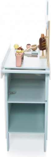 Lesena premična stojnica za sladoled je idealno orodje za razvoj otroške domišljije in socialnih veščin. Ta skrbno zasnovan set je opremljen z vsemi potrebnimi pripomočki, vključno z realističnimi sladolednimi dobrotami in zamrzovalnikom, da sladoled ostane vedno svež. Otroci se lahko igrajo sladoledarja in ustvarjajo slastne sladoledne priboljške.