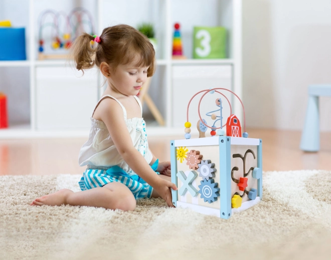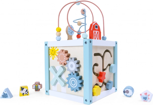 Ta lesena aktivnostna kocka je idealna igrača za otroke od 18 mesecev naprej. Učne in zabavne prvine, kot so kroglični labirint, vstavljanje oblik in vrtljiva zobata kolesa, otroke popeljejo v svet učenja in igre. Kocka ni le zabavna, temveč prispeva tudi k razvoju logičnega in prostorskega mišljenja.