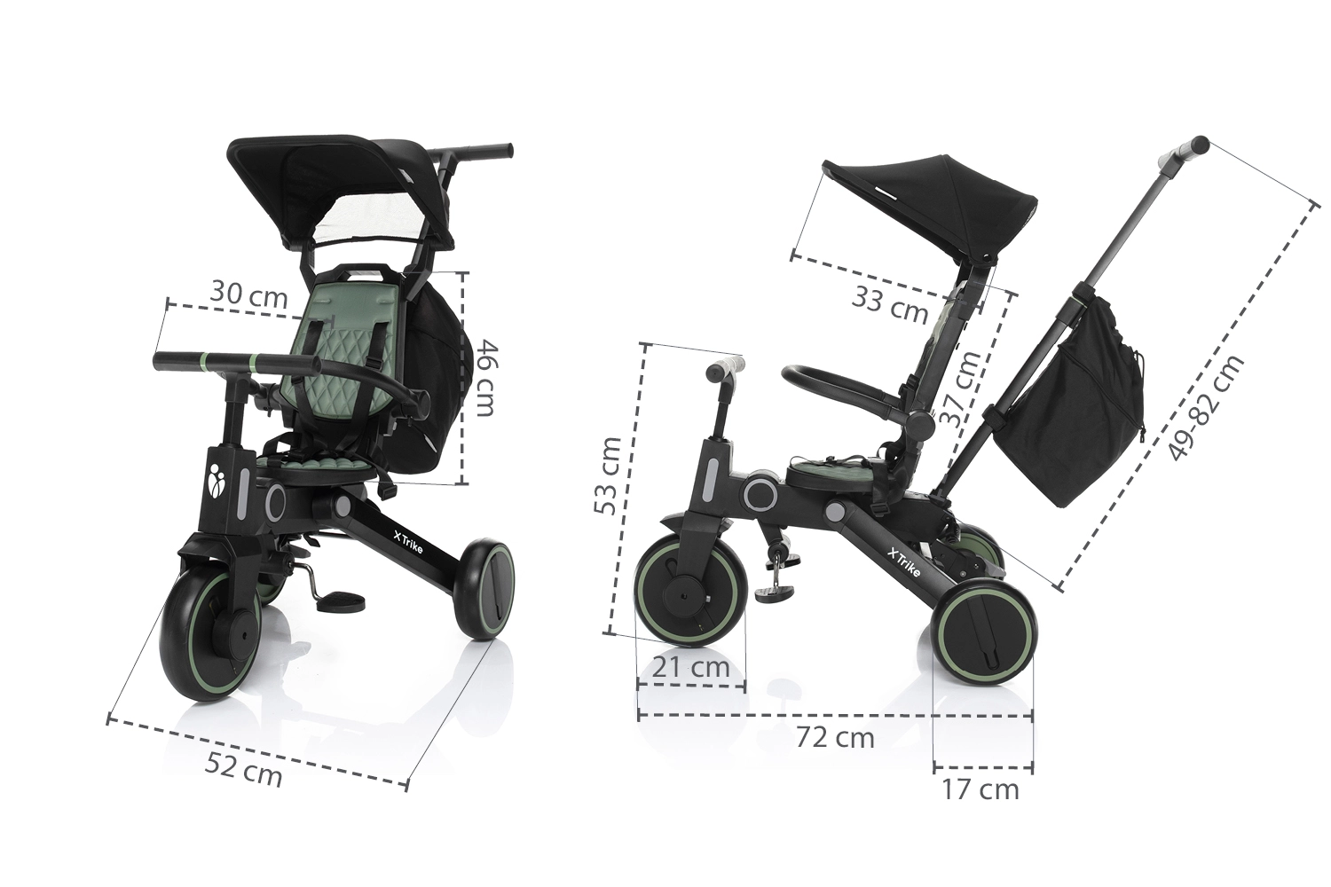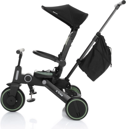 Multifunkcionalni otroški tricikel X Trike 7 v 1 je pametna alternativa vozičku, ki raste z otrokom. Ponuja vožnjo v smeri ali nasproti smeri, upravljanje z vodilno palico in enostavno zlaganje na kompaktne dimenzije. Za maksimalno udobje in varnost ima oblazinjen sedež, 5-točkovne pasove, nastavljivo varovalo, strešico proti soncu in nožno zavoro. Odstranljive pedale lahko uporabite kot pedale ali kot oporo za noge.