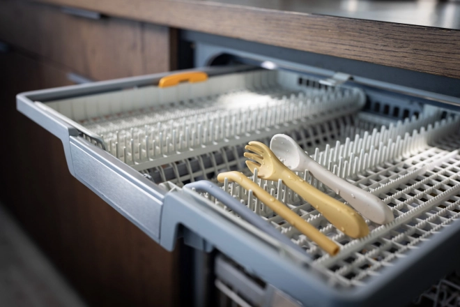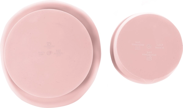 Posoda je izdelana iz varnega silikona za stik z živili, ki je netoksičen in odporen proti razbitju. Za malčke je silikon naravnejši kot plastika ali kovina. Otroci pogosto raziskujejo svet z usti, in pri igranju s posodo ter grizenju vanjo ni nevarnosti poškodb, saj je izdelana iz prožnega, mehkega in hkrati zelo trpežnega materiala. Močan protizdrsni prisesek zagotovi, da bosta skledica in razdeljen krožnik ostala na mizi ali na pladnju visokega stola, s čimer se prepreči prevrnitev ali padec; za bolj igrive otroke bo to posodo zelo težko dvigniti in vreči na tla.