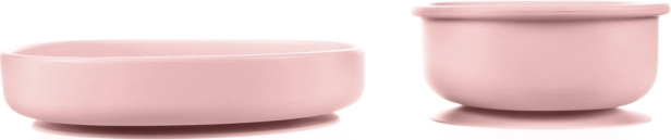 Komplet posode iz silikona za stik z živili vsebuje skledico s povišanimi robovi in priseskom, razdeljen krožnik s priseskom, nastavljiv slinček in žličko.