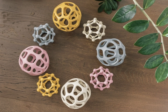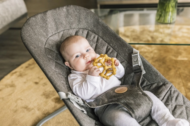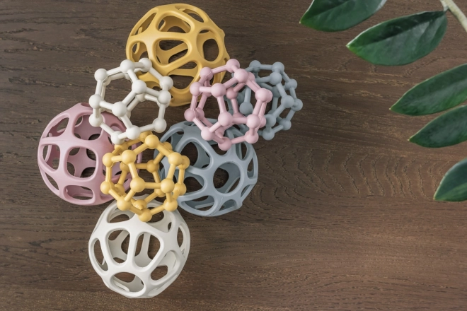 Grizalo je izdelano iz varnega silikona za stik z živili, ki je netoksičen in odporen proti lomljenju. Za majhne otroke je silikon naravnejši kot plastika ali kovina. Zaradi svoje oblike odlično sede tudi v najmanjšo pest in otrok ga zlahka prime iz katerega koli kota. Oblikovanje grizala spodbuja motoriko rok, zlasti koordinacijo roka-oko. Različne teksture poskrbijo za stimulacijo obremenjenih in občutljivih dlesni med izraščanjem zobkov.