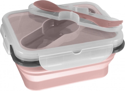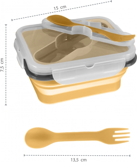 Ta škatla za prigrizke je izdelana iz varnega silikona za stik z živili, ki je nestrupen in odporen proti razbitju. Njena velika prednost je enostavno zlaganje, zaradi katerega se njen volumen zmanjša do 60 %, zato je idealen sopotnik na izletih. Pokrov zelo dobro tesni, v sebi ima vgrajen predalček za jedilni pribor, žlička z vilico sta priloženi v praktičnem etuiju.