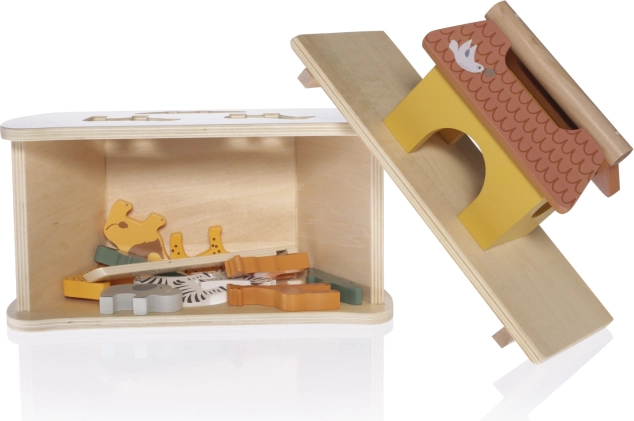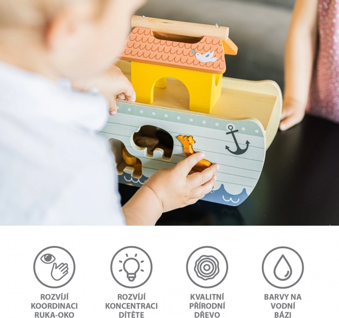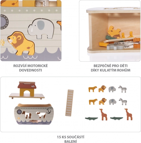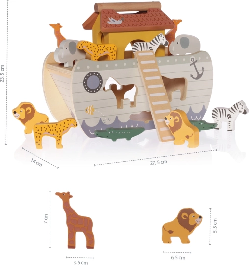 Privoščite svojemu malemu pustolovcu, da reši živalsko kraljestvo, tako kot v svetopisemski zgodbi o Noetu in barki. Lesena vstavljanka razvija koordinacijo oko–roka, logično razmišljanje, domišljijo in uči prepoznavati živali.