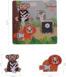 Ta kakovostna lesena montessori sestavljanka prinaša otrokom barvit svet safarija s priljubljenimi živalmi, kot so lev, zebra in opica. Vsak košček ponuja drugačno nalogo – pripeti zaponko, zavezati vezalko ali zapeti gumb – s čimer otroci naravno vadijo samostojnost in potrpežljivost.