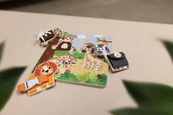 Zebra, lev in opica otroke vodijo skozi svet oblik in barv. Sestavljanka razvija osredotočenost, koordinacijo roka–oko in prostorsko zaznavanje.