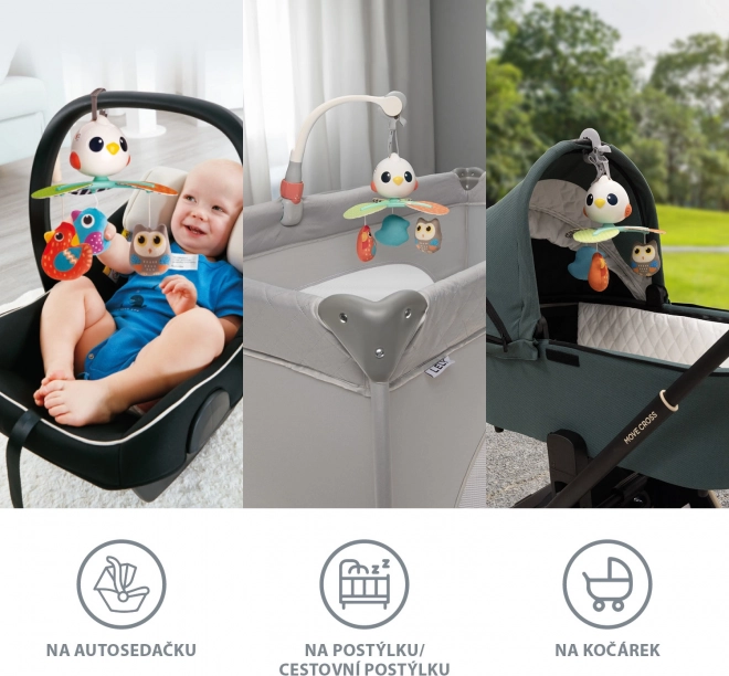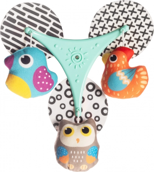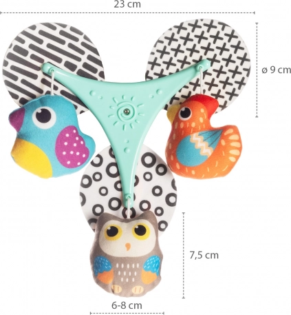 Vrteča se igračka ponuja ne le vizualno stimulacijo, temveč tudi možnost uporabe kot samostojna vrteča se igrača. S tremi načini pritrditve na avtosedež, posteljico ali voziček bo vaš otrok vedno obdan z zabavo.