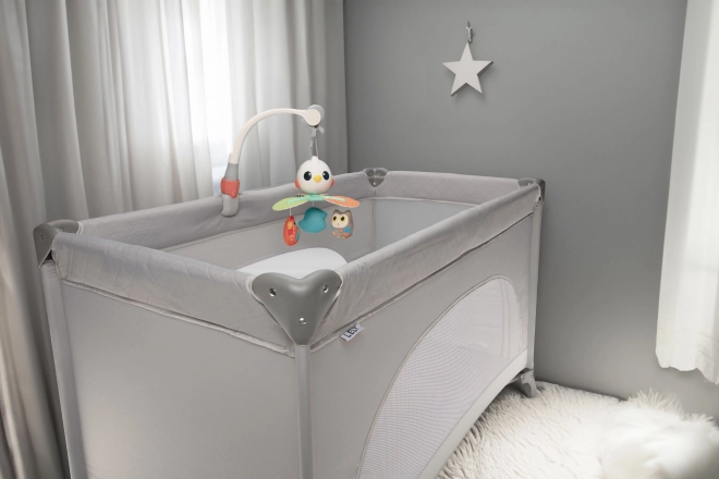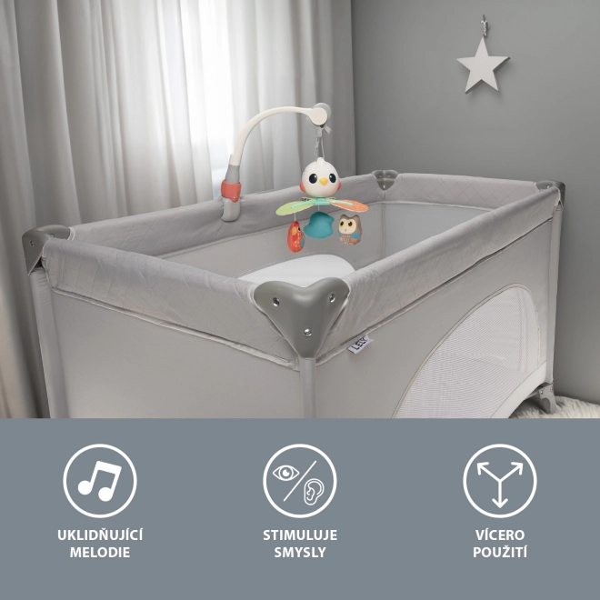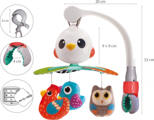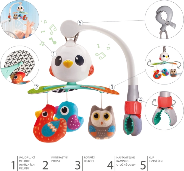 Vrtiljak spodbuja otrokove čute s pomočjo barvne mešanice in vzorcev na spodnjih delih igračk. Ponuja dražljaje za vid in sluh.