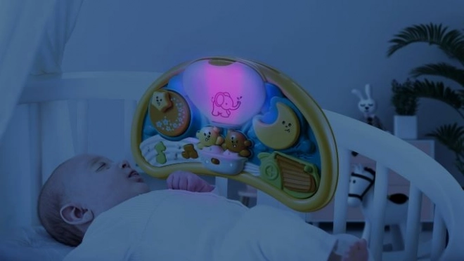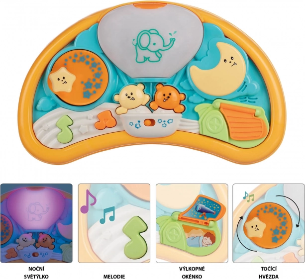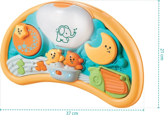 Ljubka interaktivna igrača, ki bo otroka zabavala dolge ure. Plošča v obliki lune iz kakovostne plastike ima gumbe z medvedki, zvezdicami in luno. Gumbi ob pritisku predvajajo melodije, elemente na plošči je mogoče vrteti in različno odpirati. Igrača razvija domišljijo in psihomotorične spretnosti. Ponoči igrača služi kot nežna nočna lučka, ki otroku pomaga premagati strah pred temo.