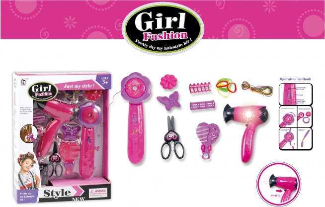 Postani mala frizerka s tem frizerskim setom za deklice! Set vsebuje vse potrebno za ustvarjanje izvirnih pričesk za zabave – od vpletanja barvnih vrvic do sušilnika in navijalk.