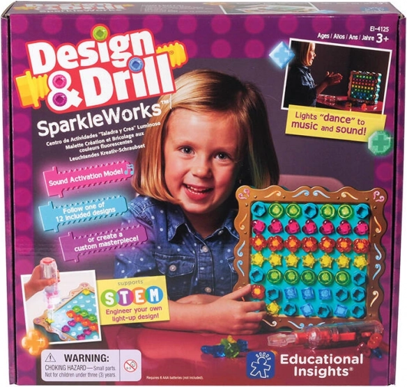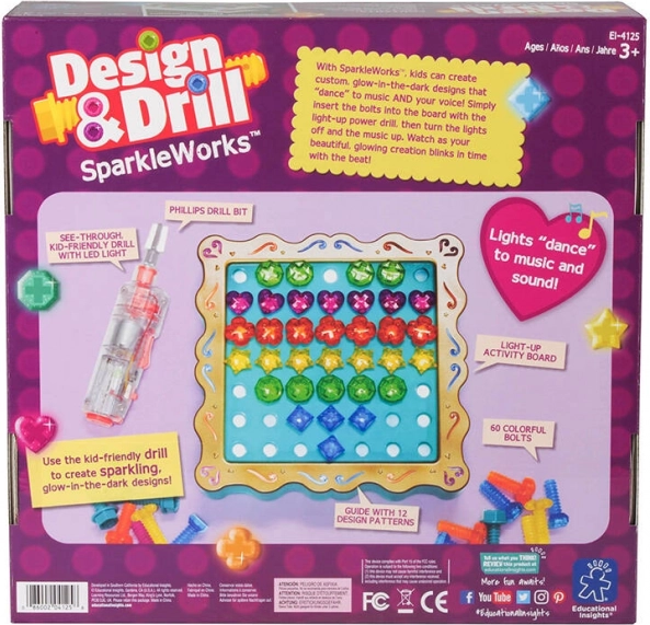 Design & Drill SparkleWorks je edinstven komplet za male ustvarjalce. Izdelek otrokom omogoča ustvarjanje svetlečih in v ritmu utripajočih dizajnov s pomočjo kakovostnega igračarskega vrtalnika z lučko. Navdihnite se s priloženimi predlogami ali si zamislite svoje!