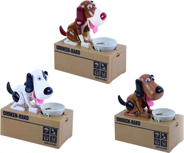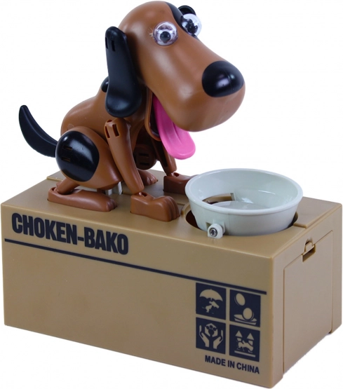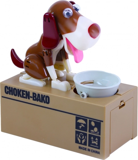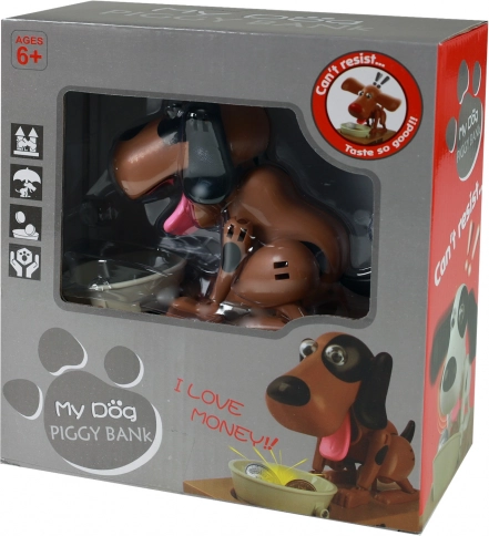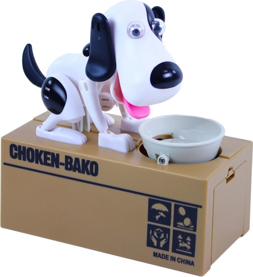 Hranilnik ponuja zabaven način varčevanja. Položite kovanec na skledico in opazujte, kako ga kuža poje ter shrani v notranjost hranilnika.