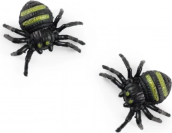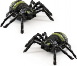 Dva plastična pajka s črnimi telesi in zelenimi črtami na hrbtu, idealna za dekoracijo ali dodatke za noč čarovnic.