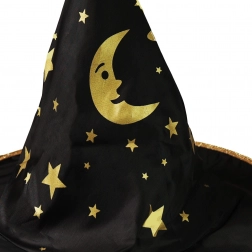 Ta čudovit otroški čarovniški klobuk je nepogrešljiv dodatek za male čarovnike in čarovnice. Njegov klasičen dizajn v črni barvi z zlatimi motivi zvezd in lun prinaša skrivnostno vzdušje vsaki zabavi za noč čarovnic ali tematskemu dogodku.