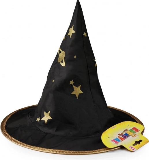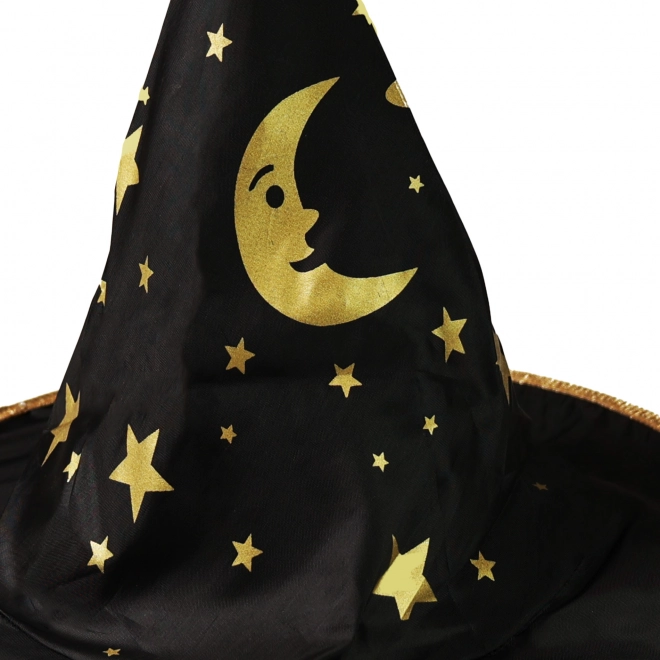 Klasičen čarovniški klobuk z elegantnimi zlatimi motivi zvezd in lun daje udeležencem čarobni šarm.