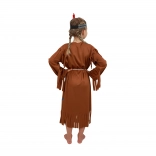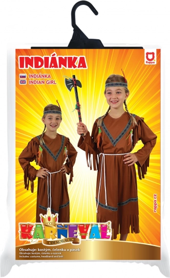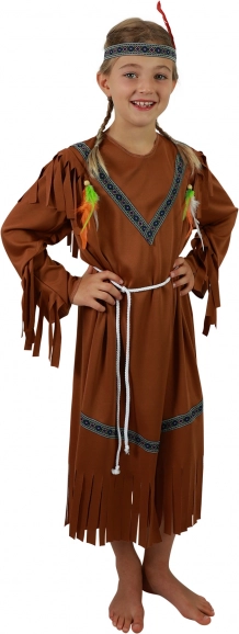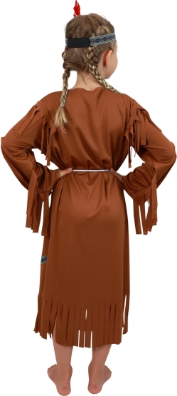 Prisrčen pustni kostum indijanke za deklice, stare 4–6 let (105–116 cm). Rjava obleka z indijanskimi vzorci, resicami in ujemajočim trakom za lase s peresom ustvari avtentičen videz za pust, šolsko prireditev in otroške igre. Priložena je tudi vrvica kot pas. Sekira ni del pakiranja.