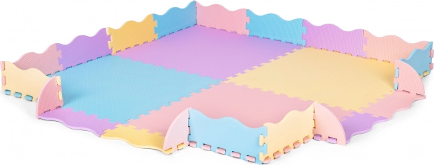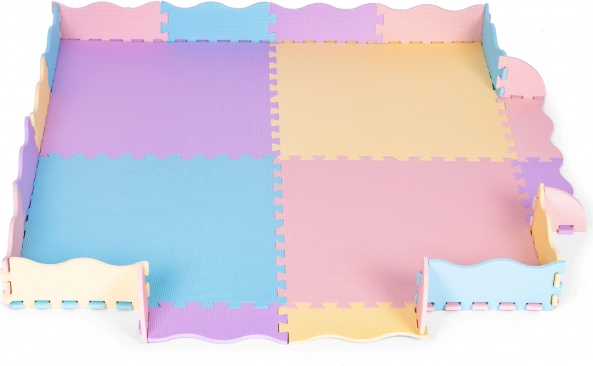 V kompletu so kvadratni deli in robne letvice, iz katerih preprosto sestavite veliko podlogo 141,5 × 141,5 cm ali dvignjene robove za praktično ograjico/suhi bazenček (pribl. 119 × 119 cm). Podloga je primerna za vse vrste tal, je preprosta za čiščenje z vlažno krpo in odporna za vsakodnevno uporabo.