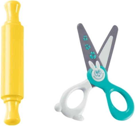 Vključuje valjar in škarje z varnim dizajnom za otroke.
