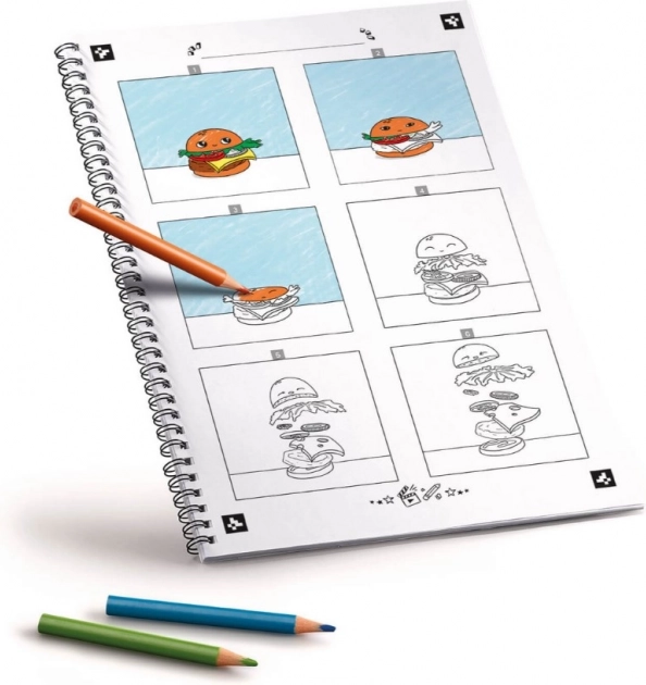 Otroci pobarvajo predloge ali si izmislijo lastne zgodbe tako, da jih zapišejo v pripravljene prazne okvirje. R risbe je mogoče preprosto spremeniti v prave animirane zgodbe. Dovolj je, da v posebej ustvarjeni brezplačni aplikaciji fotografirate 12 barvnih grafik, ki so nameščene na dveh sosednjih straneh zvezka, in končano je.