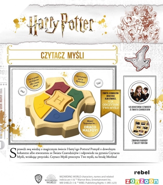 Prava poslastica za vse oboževalce Harryja Potterja, ki želijo preveriti svoje znanje priljubljene zgodbe in na lastni koži občutiti malo magije! Spomnite se katerega koli lika ali bitja iz sveta malega čarovnika in pustite bralcu misli, da ugane vašo izbiro! Ta čarobna naprava vam bo postavila nekaj vprašanj, na katera boste odgovarjali s pritiskom na določene gumbe. Na ta način boste skupaj določili, za kateri lik gre.