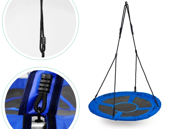 - Varnostni elementi: Sedež je zaščiten z mehko peno, vrvi pa imajo varnostne kovinske obročke.