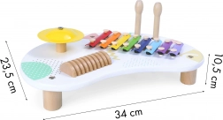 Otroška glasbena mizica ECOTOYS je idealna izbira za male glasbenike. Ponuja pester 8-tonski ksilofon, jasno zveneči činél in leseno strgalo za ritmično spremljavo. Z dvema lesenima paličicama lahko otroci preprosto preizkušajo različne barve zvoka in vadijo koordinacijo oko–roka.
