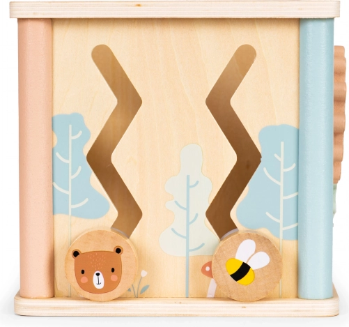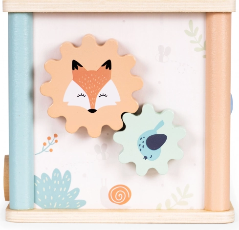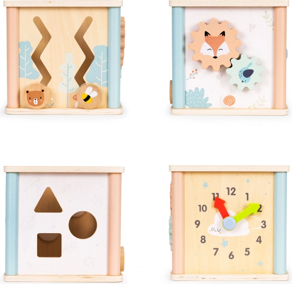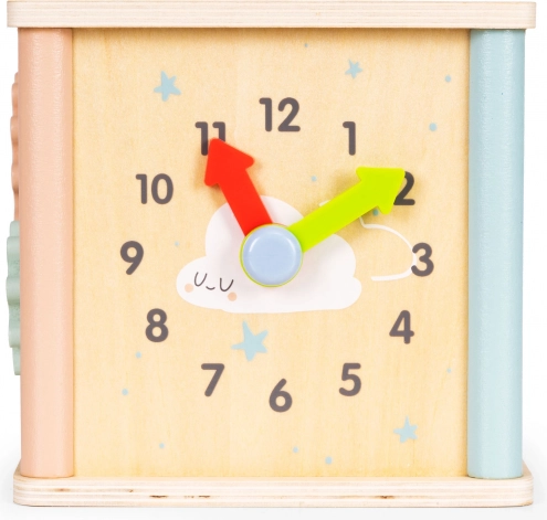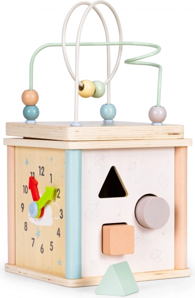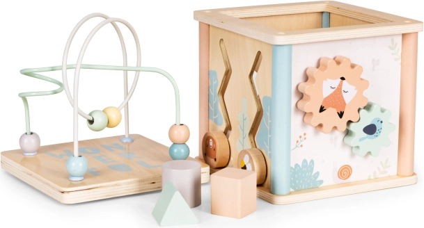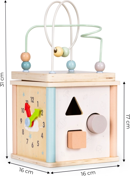 Multifunkcijska lesena aktivna kocka ECOTOYS združuje zabavo in učenje v enem. Ponuja kroglični labirint, vrtljiva zobata kolesa, uro s premičnimi kazalci in sortirnik oblik z barvnimi kockami. Spodbuja fino motoriko, koordinacijo oko–roka, prepoznavanje barv in oblik ter podpira samostojno igro. Varna zasnova in prijetne pastelne barve navdušijo otroke in starše.