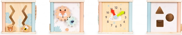 • 4 dejavnosti v eni: labirint, zobata kolesa, ura, sortirnik oblik