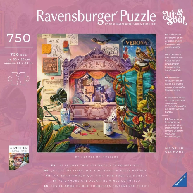 Potopite se v romantično zgodbo z izdajo RAVENSBURGER Art & Soul, kjer se srečajo umetnost, kakovost in popolna izkušnja sestavljanja. Kvadratna sestavljanka Romeo in Julija z merami 50 × 50 cm izstopa po natančno izrezanih koščkih, ki se popolno prilegajo, ter po edinstveni likovni zasnovi.