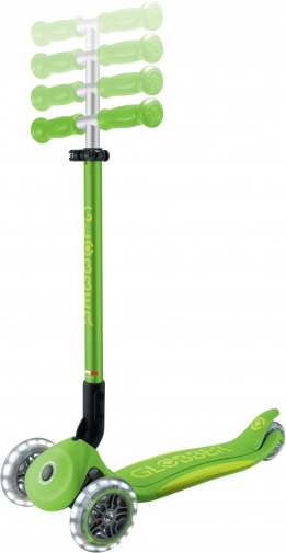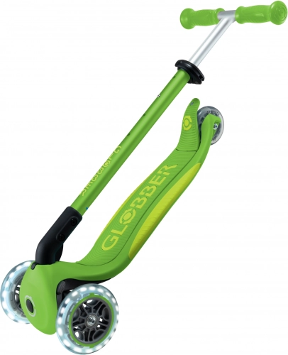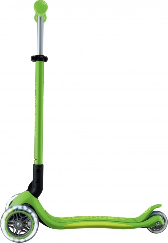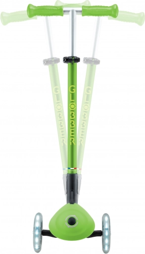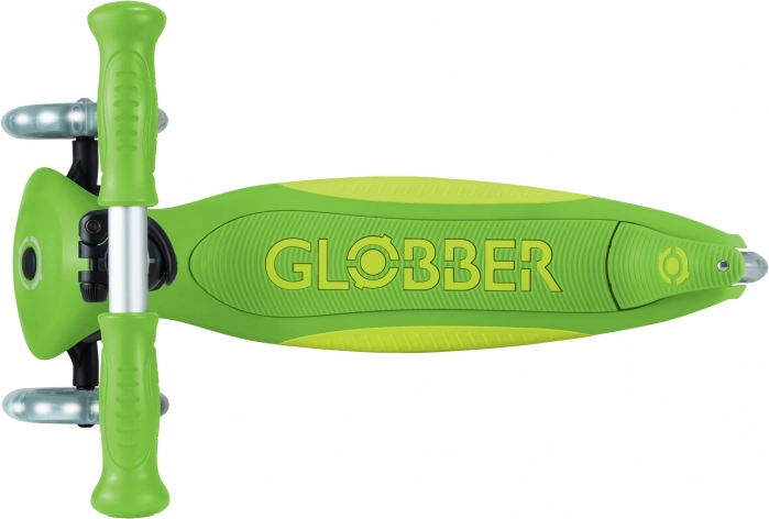 Skiro GLOBBER Primo Foldable Plus Lights izstopa s kombinacijo stabilnosti, varnosti in zabave. Dve veliki sprednji kolesi premera 120 mm z svetlečimi LED diodami na dinamo navdušita na prvi pogled in izboljšata vidnost. Nizka in široka deska z nedrsečo površino podpira stabilen položaj in udobno upravljanje za začetnike.