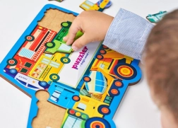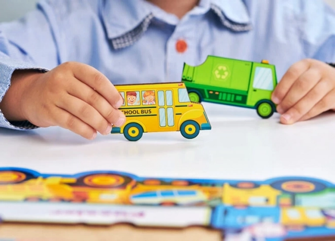 Vsak kos prikazuje drugo prevozno sredstvo ali znak, zato si otroci zlahka prisvojijo nove pojme in razširijo besedišče.