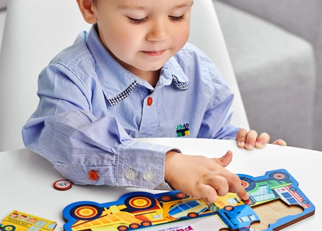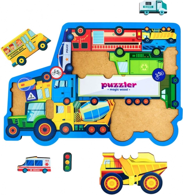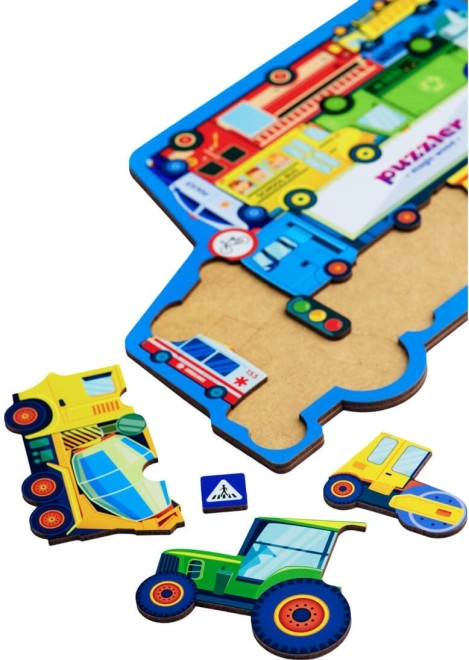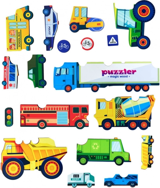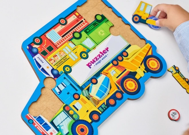 Lesena sestavljanka s temo prometa otrokom prinaša učenje na igriv način. Vsak od 18 kosov predstavlja samostojno vozilo ali prometni znak, s čimer si otroci urijo prepoznavanje oblik, besedišče in potrpežljivost. Trdna lesena izdelava zagotavlja dolgo življenjsko dobo in varno rokovanje za majhne ročice.