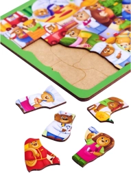 Lesene sestavljanke z medvedki otrokom predstavljajo svet različnih poklicev – od reševalca in zdravnika do glasbenika. Zahvaljujoč živopisnim ilustracijam in čvrsti leseni izdelavi ponujajo zabavo, ki hkrati podpira razvoj pomembnih veščin.